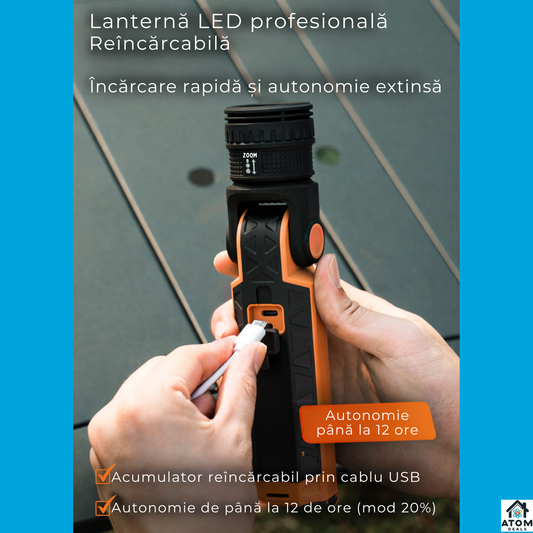 Lanterna LED multifunctionala ATOM Deals®, 1000 lm, reincarcabila USB-C, magnetica, zoom reglabil, SOS, IP54, 3000 mAh, negru/portocaliu