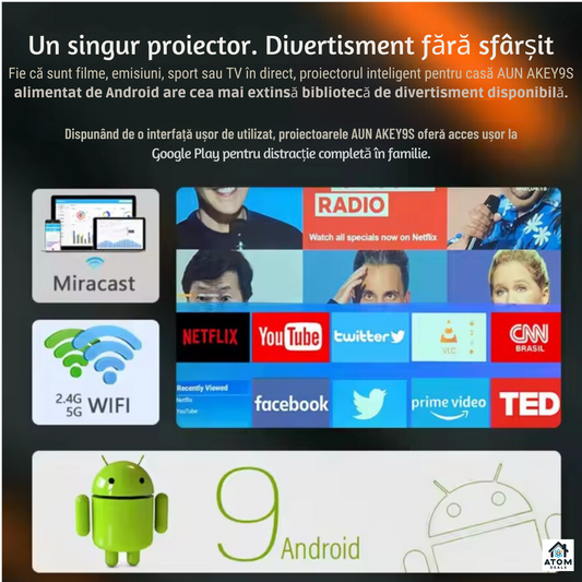 Videoproiector LED 1080P ATOM DEALS®️, Android9, WiFi, 4Ksuport, 9000lum, autofocus
