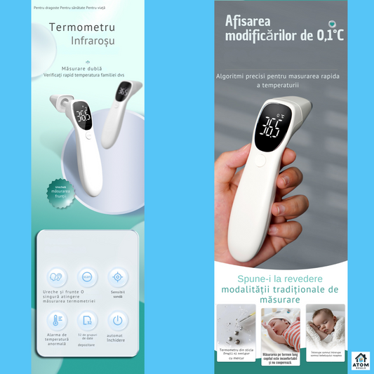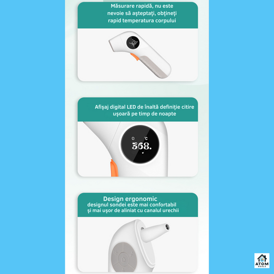 Termometru infrarosu digital 2in1 ATOM DEALS®️, frunte si ureche, pentru copii si adulti, masurare non-contact 1 secunda, precizie ±0.2°C, 32 memorii, afisaj LED, compact si usor, capac protectie, alb